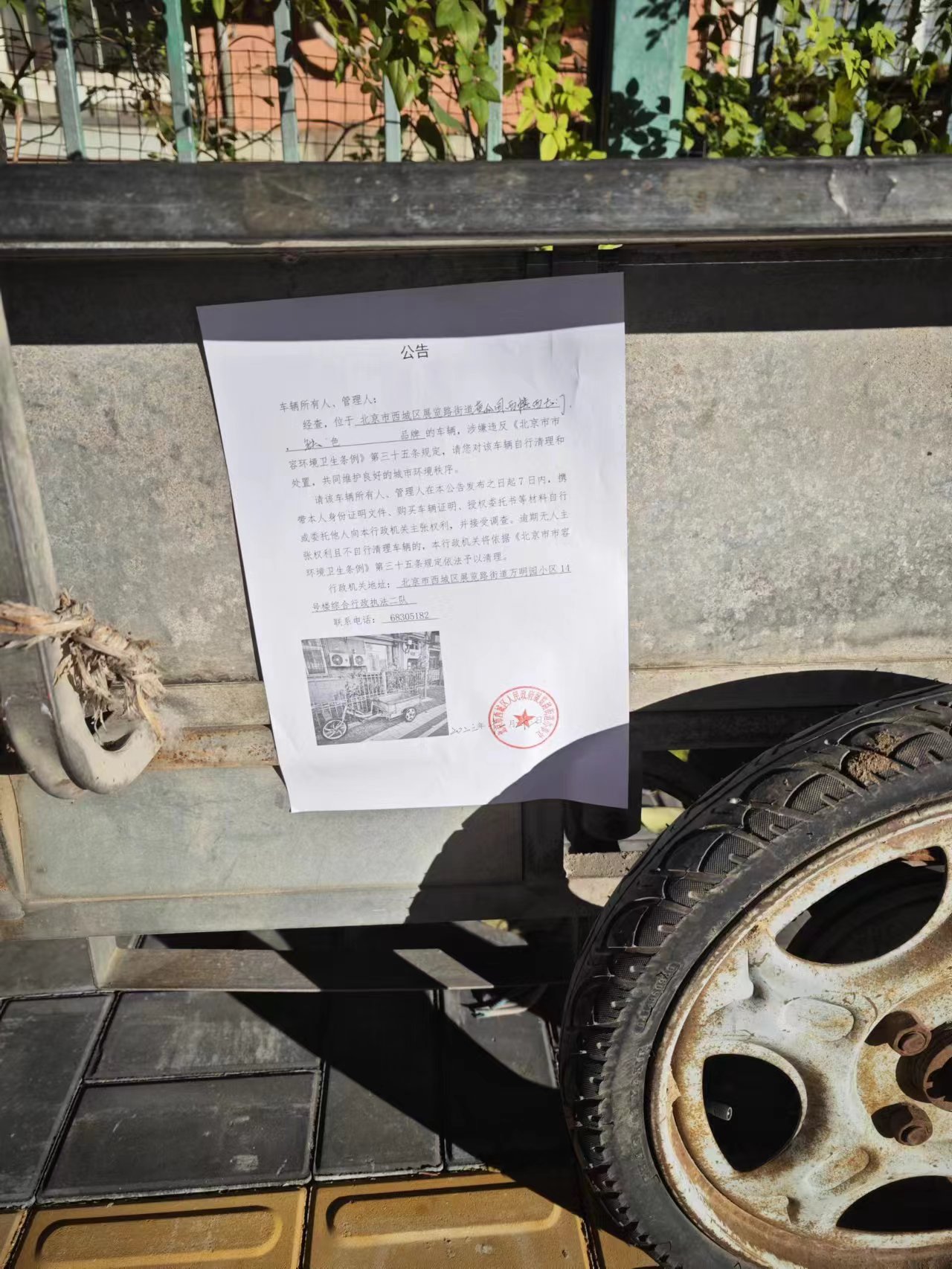 请该车辆所有人、管理人在本公告发布之日起7日内,携带本人身份证明文件、购买车辆证明、授权委托书等材料自行或委托他人向本行政机关主张权利,并接受调查。逾期无人主张权利且不自行清理车辆的,本行政机关将依据《北京市市容环境卫生条例》第三十五条规定依法予以清理。