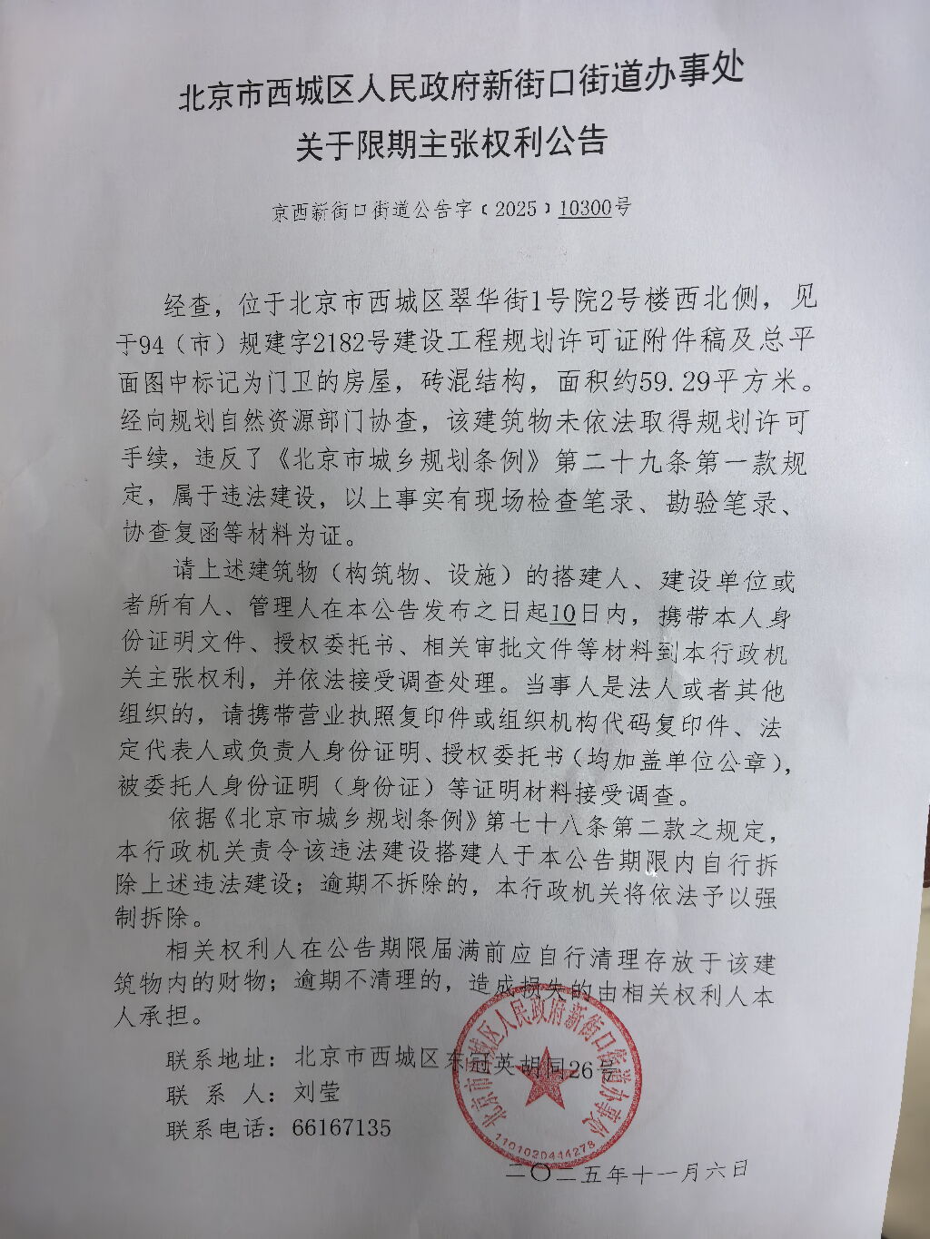 经查,位于北京市西城区翠华街1号院2号楼西北侧,见于94(市)规建字2182号建设工程规划许可证附件稿及总平面图中标记为门卫的房屋,砖混结构,面积约59.29平方米。经向规划自然资源部门协查,该建筑物未依法取得规划许可手续,违反了《北京市城乡规划条例》第二十九条第一款规定,属于违法建设,以上事实有现场检查笔录、勘验笔录、协查复函等材料为证。