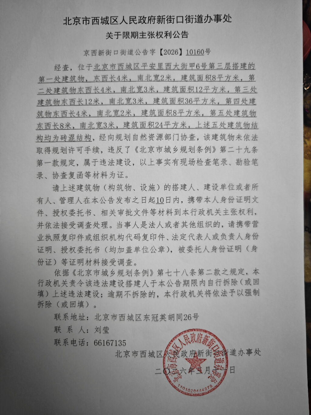 经查,位于北京市西城区平安里西大街甲6号第三层搭建的第一处建筑物,东西长4米,南北宽2米,建筑面积8平方米,第二处建筑物东西长4米,南北宽3米,建筑面积12平方米,第三处建筑物东西长12米,南北宽3米,建筑面积36平方米,第四处建筑物东西长4米,南北宽2米,建筑面积8平方米,第五处建筑物东西长8米,南北宽3米,建筑面积24平方米,上述五处建筑物结构均为砖混结构,经向规划自然资源部门协查,该建筑物未依法取得规划许可手续,违反了《北京市城乡规划条例》第二十九条第一款规定,属于违法建设,以上事实有现场检查笔录、勘验笔录、协查复函等材料为证。