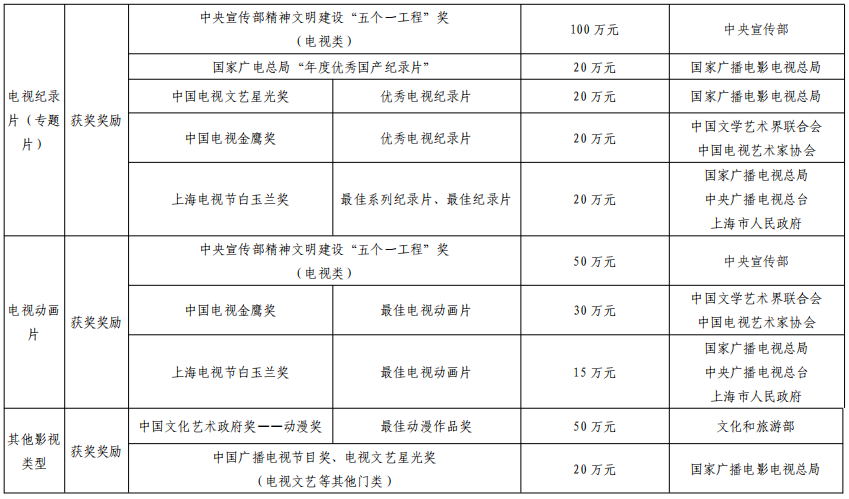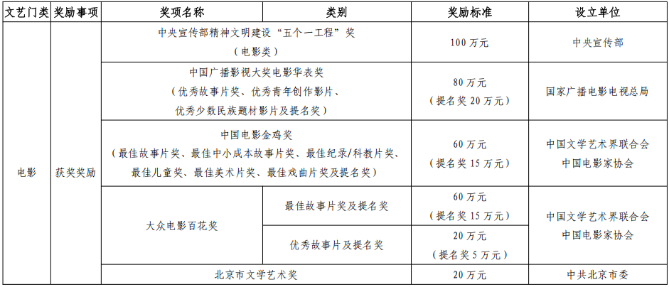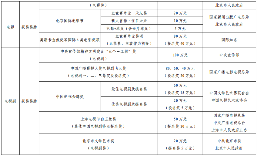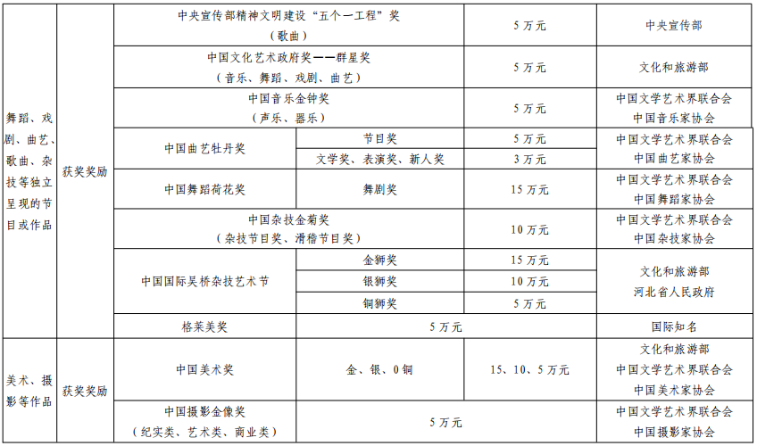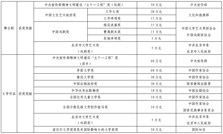 第十二条 文艺精品奖励的申报项目应为获得过中央宣传部等国家部委批准设立的常设全国性文艺奖项或在国内外产生重大影响力的优秀文艺作品,具体奖励标准如下: