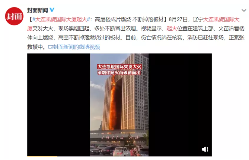 8月27日16时许,大连金普新区凯旋国际大厦发生火情。网上出现的多段视频显示,外型像一个“门”的凯旋国际大楼,从19楼开始起火,现场浓烟滚滚,火势吓人。历经7小时灭火,金普新区凯旋国际大厦火情明火被扑灭,所幸无人员伤亡。