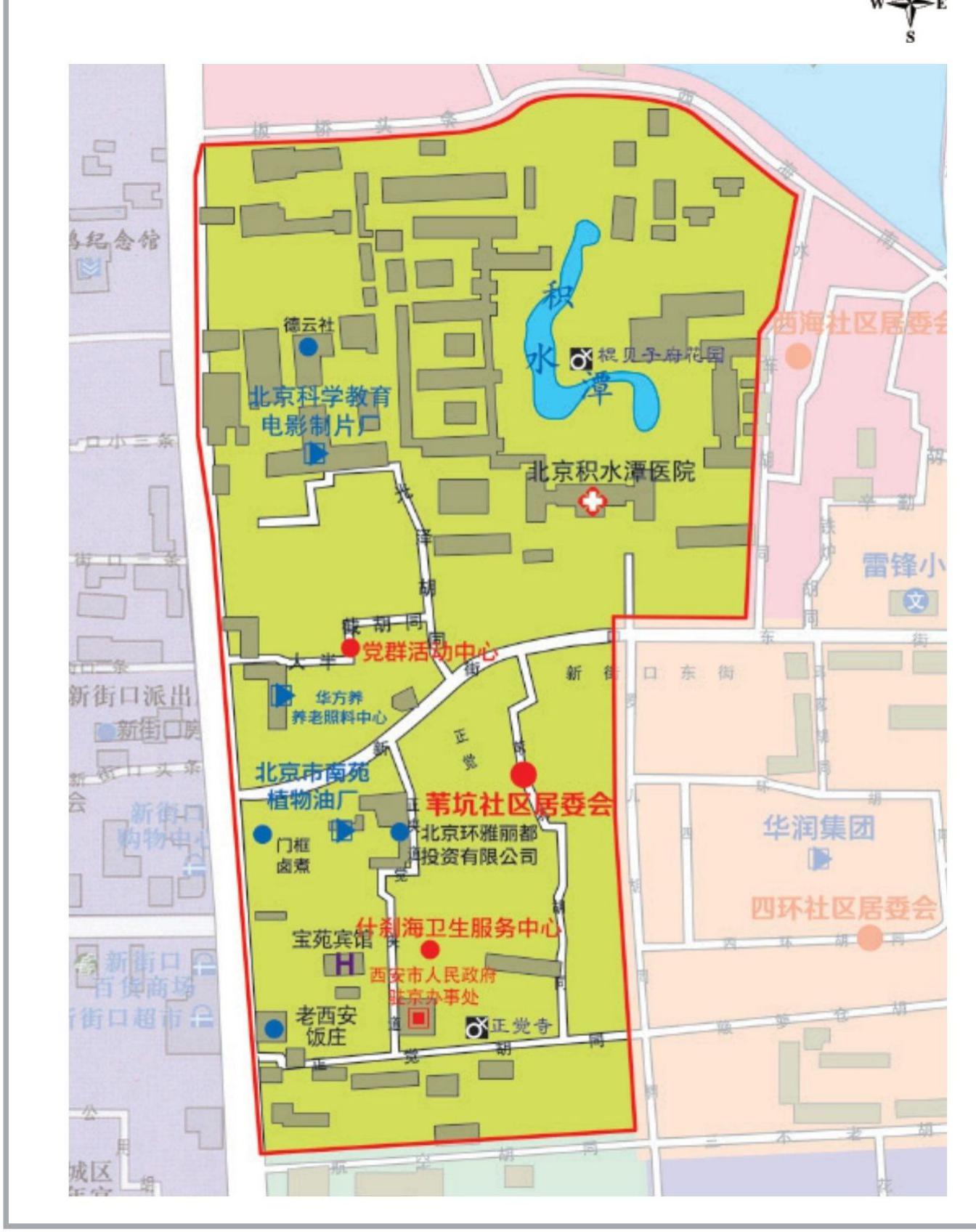 辖区有北京新影集团、北京市积水潭医院、华方养老照料中心、北京环雅丽都投资有限公司、什刹海街道卫生服务中心、西安驻京办、北京市南苑植物油厂等7个大单位,以老字号老西安饭庄为地标的小微企业158个,主要分布在新街口南北大街和新街口东街,商业氛围浓厚,医疗、养老资源丰富,居民生活便利。